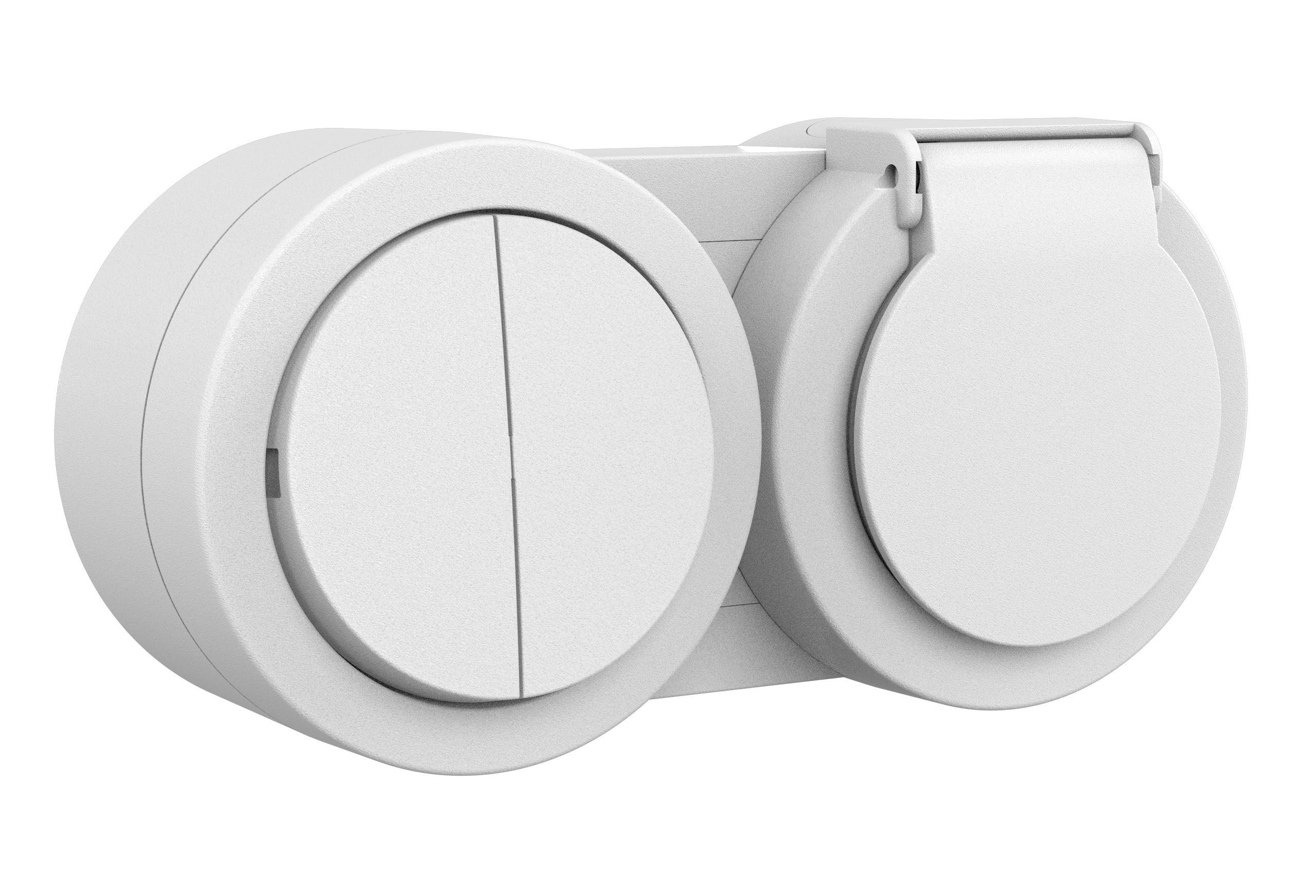 Modulul combinat Xone Ovivo în finisaj alb integrează pe același suport un comutator și o priză cu capac de protecție, cu montaj îngropat standard german. Curent nominal 16A, tensiune 230V / 50Hz.