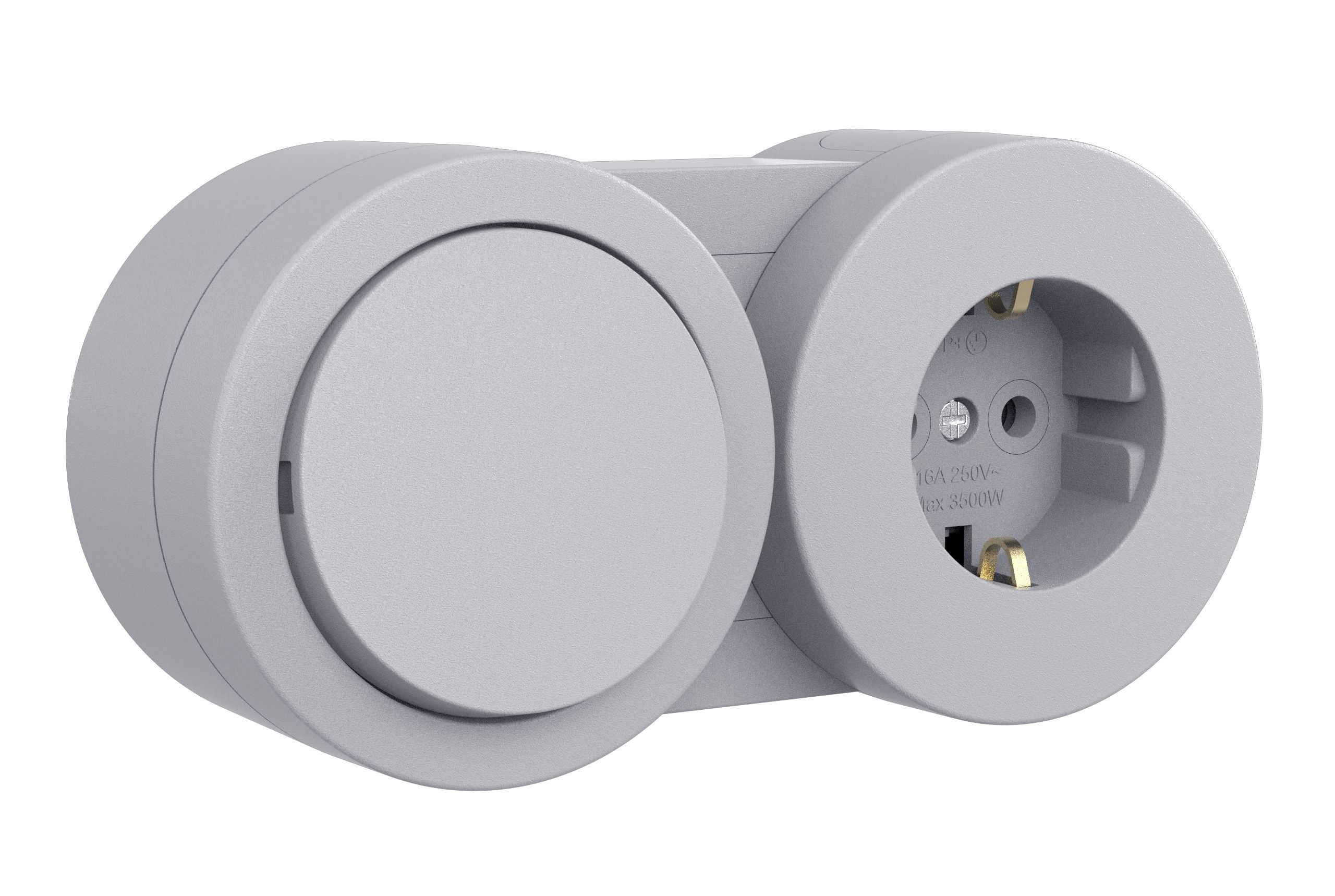 Modulul combinat aplicat Xone Ovivo în finisaj gri integrează pe același corp un întrerupător și o priză cu capac, cu montaj aparent și grad de protecție IP54. Curent nominal 16A, tensiune 230V / 50Hz. Potrivit pentru băi, spații tehnice și garaje.