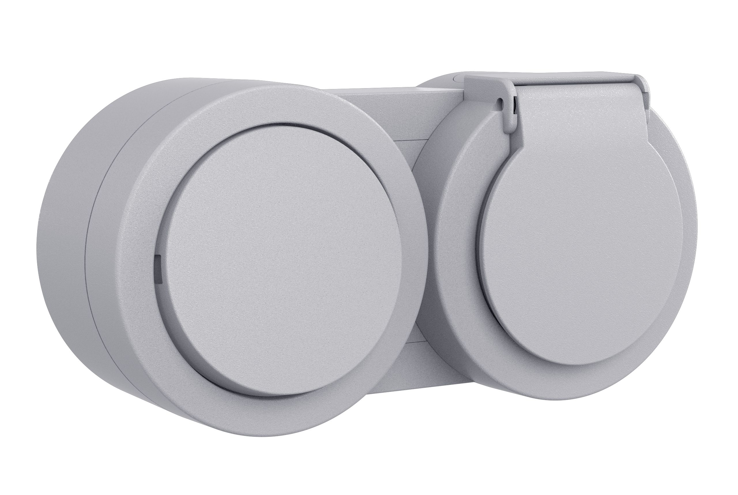 Modulul combinat Xone Ovivo în finisaj gri integrează pe același suport un întrerupător și o priză cu capac de protecție, cu montaj îngropat standard german. Curent nominal 16A, tensiune 230V / 50Hz.